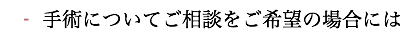 麻酔科医師の術前診察は、原則として手術前日(場合により当日)に入院なさってから行いますが、ご不安なことなどおありの場合には、看護師に申し出ていただけましたら、ご入院前に麻酔科医がお電話したり、外来受診の際にお話ししたりして、少しでも不安が軽減されるよう努めております。些細なことでも、どうぞご遠慮なくお話し下さい。なお外来に麻酔全般について説明した「麻酔のしおり」を置いており、ご希望の方には事前にお渡ししております。